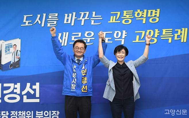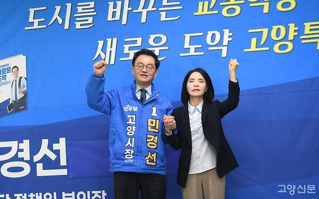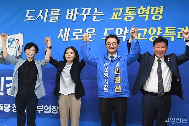 한편, 이날 합동 지지 선언을 마친 네 후보는 '진심이 승리한다', '고양시장 선거 승리하여 고양시 대도약을', '민경선과 함께' 등의 구호를 외치며 결속을 다지는 퍼포먼스를 진행했다.
