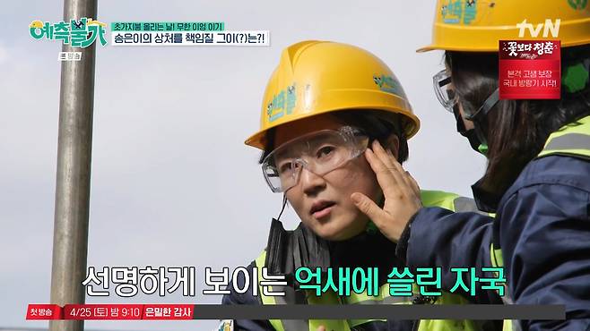 작업 중 송은이의 얼굴이 억새에 쓸려 상처가 났다.