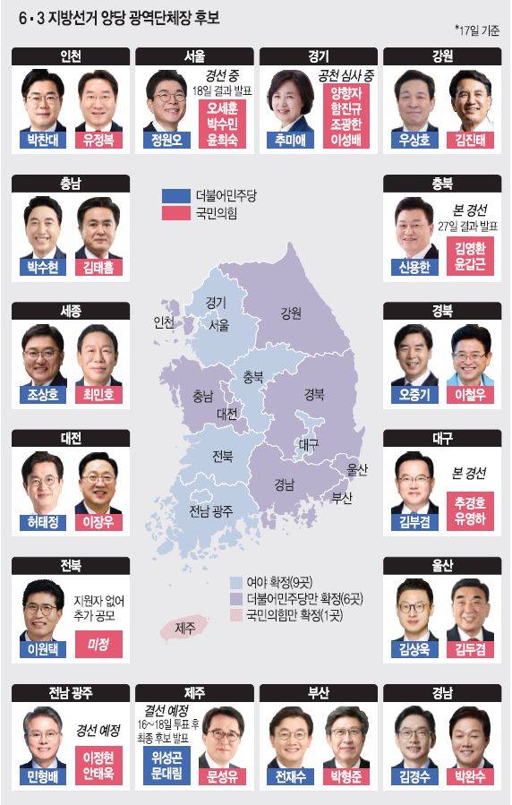 6·3 지방선거 여야 광역단체장 선거 대진표가 윤곽을 드러내고 있다. 국민의힘 서울시장 후보가 최종 확정되면 여야는 이번 주말부터 본격적으로 선거전에 돌입할 전망이다. 더불어민주당에서 광역단체장 선거 16곳 중 경북 제외 15곳 석권 시나리오가 거론되는 가운데 국민의힘 지도부는 서울과 부산 사수를 승리의 마지노선으로 설정했다.