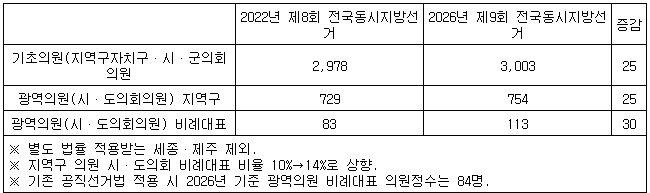 [표] 제9회 전국동시지방선거 의원정수·중대선거구제 실시지역(종합)