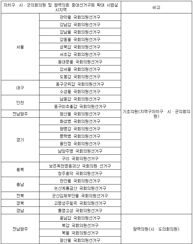 자치구·시·군의회의원 및 광역의회 중대선거구제 확대 시범 실시지역