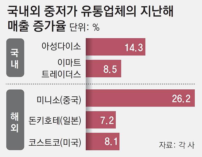 해외 주요국에서도 가성비 브랜드의 강세가 뚜렷하다. 중국의 대표 중저가 생활잡화 체인인 ‘미니소’ 운영사 미니소그룹홀딩스의 지난해 매출은 214억4380만 위안(약 4조6200억 원)으로 전년(169억9402만 위안) 대비 26.2% 급증하는 등 사상 최대 실적을 기록했다.
