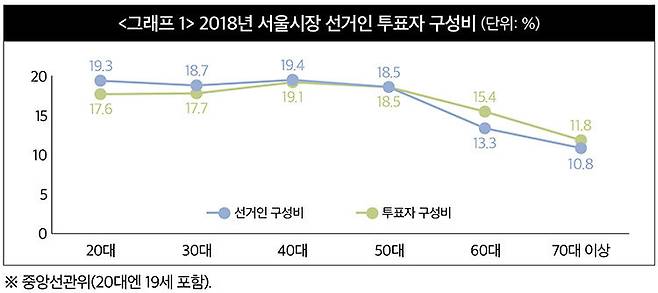 2018년 서울시장 선거는 2022년과 정반대였다. 그해 선거 결과는 민주당 박원순 52.79%, 자유한국당 김문수 23.34%, 바른미래당 안철수 19.55% 등으로 민주당이 크게 이겼다. 민주당 압승의 비결은 2022년과 마찬가지로 높은 투표율, 선거인과 투표자 구성비에 그 답이 있다. 2018년 서울시장 선거의 투표율은 표본조사 기준으로 59.8%였다. 전국 평균보다 조금 낮은 수준이었다.그해 서울시장 선거의 20∼40대 선거인 비중은 57.4%인데 투표자 비중은 54.4%였다. 20∼40대가 투표에 대거 참여하면 선거인과 투표자 비중의 차이가 거의 없었던 셈이다. 60대 이상 선거인은 24.1%인데 투표자 비중은 27.2%로 3.1%포인트만 늘어났다. 50대 선거인과 투표자 비중은 각각 18.5%로 같았다. 당시 선거 지형도 민주당에 유리했다. 20∼40대는 진보성향으로 볼 수 있다. 즉 20∼40대의 투표자 비중 54.4%에선 민주당 득표율이 높았다고 추정할 수 있다. 50대는 보수와 진보가 균형을 이루는 세대로 투표자 비중은 18.5%였다. 50대에선 민주당과 보수 야당(한국당+바른미래당)의 득표율이 비슷했다고 추정할 수 있다. 60대 이상은 보수 야당이 유리한 세대로 투표자 비중은 27.2%에 그쳤다. 2018년 서울시장 선거는 '20∼40대 vs 60대 이상' 구도였던 셈이다(<그래프 1> 참조).