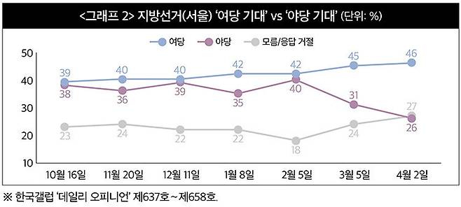 한국갤럽이 매주 발표하는 여론조사 중에 '지방선거 결과 기대'란 항목이 있다. 한국갤럽은 전국 단위 선거마다 이런 조사 결과를 발표한다. 선거일 1년여 전부터 대략 한 달 간격으로 진행되는 '선거 결과 기대'는 상당히 신뢰할 만하다. 그동안 한국갤럽이 실시한 '선거 결과 기대'는 실제 전국 단위 선거 결과와 거의 일치하곤 했다. 지난해 10월부터 실시된 '지방선거 결과 기대'를 보면 국민의힘의 서울시장 선거 전망은 처음엔 그리 나쁘지 않았다. 이 대통령과 민주당 지지율의 고공 행진, 국민의힘의 고전 속에서도 서울시장 선거 전망은 한동안 팽팽한 접전을 유지했다(<그래프 2> 참조).