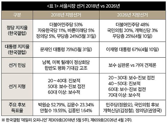 8년이 지난 2026년엔 세대별 선거 지형이 많이 달라졌다. 20∼30대와 60대는 보수와 진보가 균형을 이루는 세대로 바뀌었고, 40∼50대는 진보로, 70대는 보수로 구분해 볼 수 있다. 그때와 달리 2026년은 보수 분열은 아직 일어나지 않고 있다. 개혁신당은 3% 안팎의 지지율 한계를 돌파하지 못하고 있고, 김문수 전 경기지사, 유승민 전 의원, 한동훈 전 국민의힘 대표 등은 보수 신당 창당과 같은 세력화에 선을 긋고 있다.