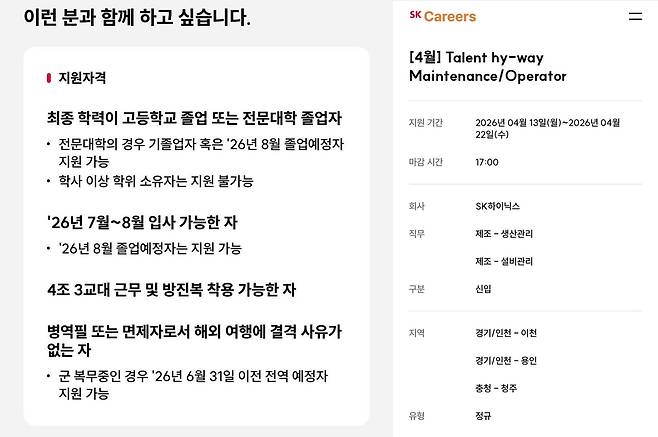 이 공고에서 눈여겨 볼 지점은 ‘학사 이상 학위 소유자는 지원 불가’라는 조건이 명시됐다는 점이다. SK하이닉스 측은 “4년제 대학 재학생은 자퇴 후 지원이 가능하다”고 말했다.
