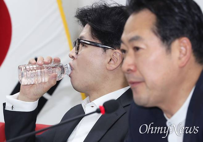 | ▲ 2024년 8월 8일 한동훈 국민의힘 대표가 서울 여의도 중앙당사에서 열린 최고위원회의에서 목을 축이고 있다. 오른쪽은 장동혁 최고위원. |