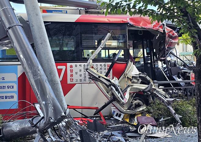 18일 오전 9시 50분께 광주 남구 진월동 백운교차로 인근 한 도로에서 시내버스가 주행 중 스타렉스 승합차와 추돌한 뒤 인도에 세워진 전신주와 시설물을 잇달아 들이받았다.