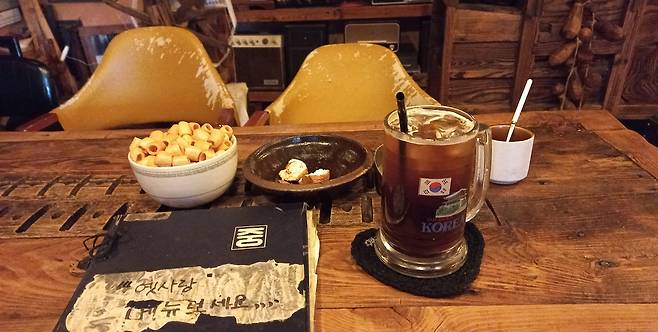 더구나 아이스 아메리카노는 그냥 잔이 아니라 맥주잔, 그것도 유리로 된 생맥주잔에 받침대까지 밑에 깔아서 나간다. 손님 상에 나오는 컵도 실제 사장님이 수집하신 물건이라고 하니, 진정 민속박물관이라 부를 만하지 않을 수 없다.