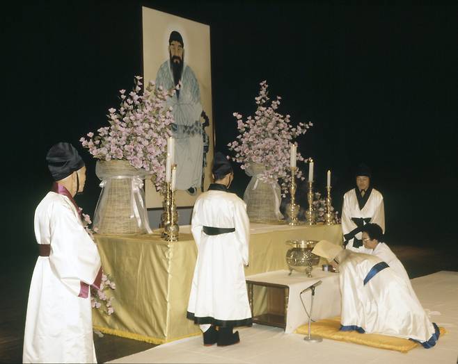 | ▲ 대종교가 1985년 개천날 국립극장에서 올린 개천절 경축대제전에서 선의식을 올리고 있다 |