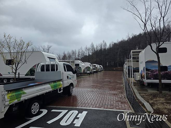 | ▲ 오는 4월 16일 개장을 앞둔 태백산국립공원 당골탐방지원센터 인근에 있는 카라반 캠핑장. 노인일자리가 없었다면, 운영하기 쉽지 않았다고 한다. |