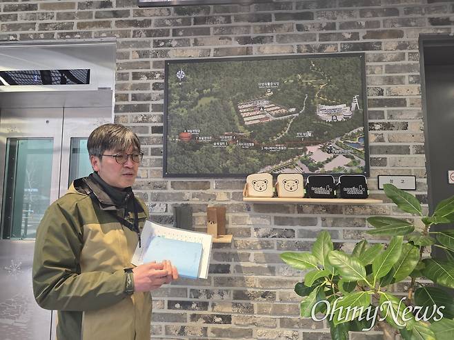 | ▲ 유민 국립공원공단 태백산국립공원사무소 자원보전과장. 이곳 노인일자리 사업은 그의 제안에 의해서 시작됐다. 벽면에 걸린 조감도에는 당골탐방지원센터을 중심으로 한 시설을 볼 수 있다. |
