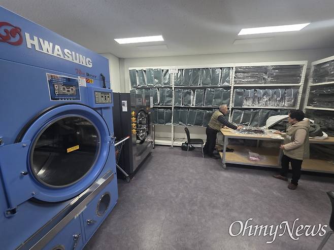 | ▲ 캠핑세탁 시설. 캠핑카를 이용한 탐방객들이 사용한 이불을 세탁한 후 진공포장을 하는 일자리다. 세탁한 이불은 1인용 이불은 1만원, 2인용은 1만5천원에 대여하고 있다. |
