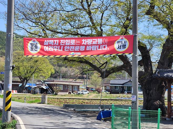 기자는 지난 16일 살목지가 있는 예산군 광시면 대리 마을을 찾았다. 마을 입구에는 보호수인 느티나무(수령 383년)가 서 있다. 느티나무 앞에는 '살목지 진입로는 차량교행이 어려우니 안전운행 바란다'라는 현수막이 걸렸다. 한낮인데도 살목지로 향하는 차들이 수시로 포착됐다.