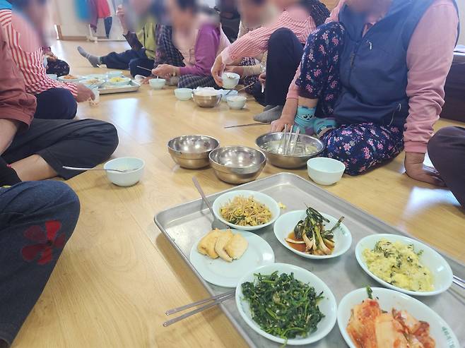 | ▲ 16일 충남 예산군 광시면 대리 마을 주민들이 경로당에 모여 함께 식사를 하고 있다. |