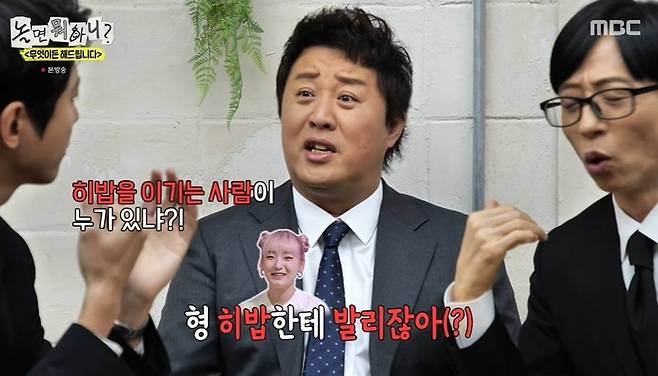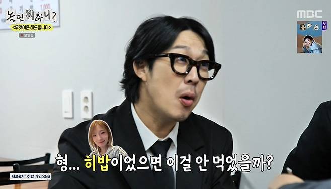 정준하가 보란 듯이 제육을 집어 들며 먹으려고 하자 유재석은 "소화 못 할 거 먹지 마라"라고 했다. 정준하는 바로 내려놨고, 하하는 "히밥이었으면 이걸 안 먹었을까? 쯔양이면 한입에 들어갔지"라고 도발하기 시작했다.