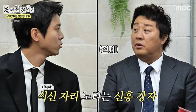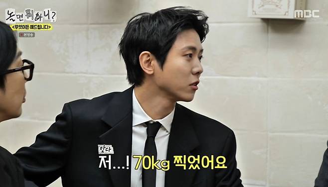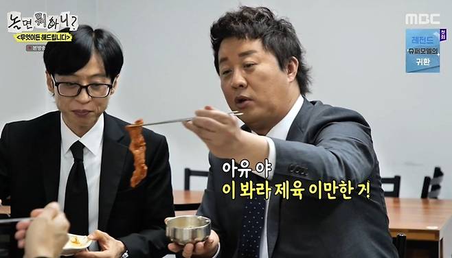 제육볶음을 먹던 정준하의 젓가락질이 느려지자 유재석은 "제육 먹으려고 데려왔는데, 안 먹으면 어떡해"라고 했고, 하하는 "배부르지?"라고 눈치를 줬다.