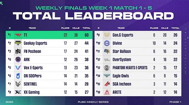 '60점' T1, 1주차 '위클리 파이널' 1일차 1위…지케이 2위·FN포천 3위 (PWS: 페이즈 1) [종합]