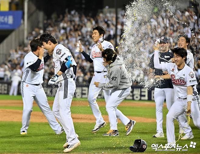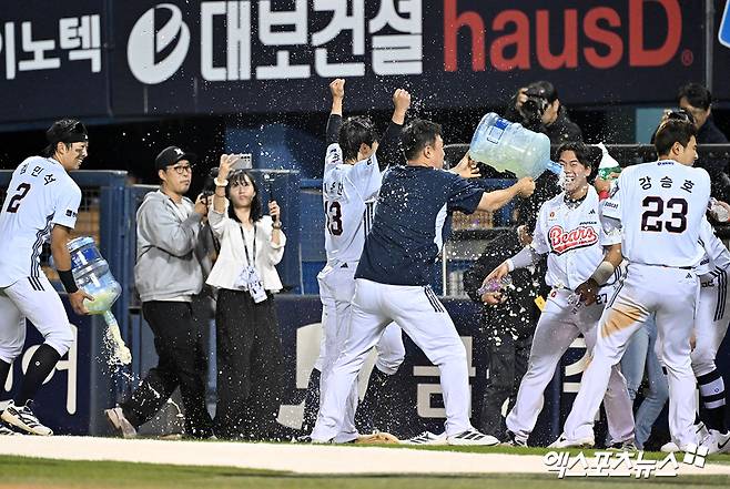 (엑스포츠뉴스 잠실, 김근한 기자) 두산 베어스 내야수 이유찬이 찬물 세례를 맞으며 환하게 웃었다. 연장 10회말 극적인 끝내기 2루타로 두산 베어스의 승리를 이끈 뒤 생애 첫 끝내기 주인공 물세례를 경험했다.