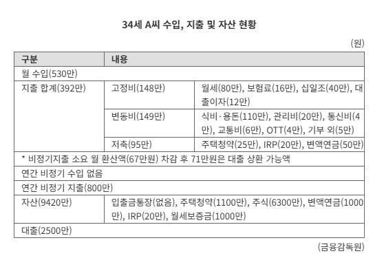 34세 A씨 월 수입은 530만원이다. 연간 비정기 수입은 없다. 월 지출은 392만원이다. 고정비가 월세(80만원), 보험료(16만원), 십일조(40만원), 대출이자(12만원) 등 148만원이다. 변동비는 식비·용돈(110만원), 관리비(20만원), 통신비(4만원), 교통비(6만원), OTT(4만원), 기부 외(5만원) 등 149만원이다. 저축은 주택청약(25만원), IRP(20만원), 변액연금(50만원) 등 95만원씩 하고 있다. 남은 138만원 중 67만원은 비정기지출로 쓴다. 연간 금액(800만원)을 월로 환산한 금액이다. 자산은 입출금통장(0원), 주택청약(1100만원), 주식(6300만원), 변액연금(1000만원), IRP(20만원), 보증금(1000만원) 등 총 9420만원이다. 대출은 2500만원이 있다.