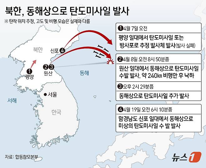 (서울=뉴스1) 김초희 디자이너 = 북한이 19일 잠수함 기지인 신포에서 동해로 탄도미사일을 발사한 것으로 확인됐다. 지난 8일 두 차례에 걸친 무력 도발에 이어 11일 만에 탄도미사일 발사로, 올해 일곱 번째 미사일 도발이다.