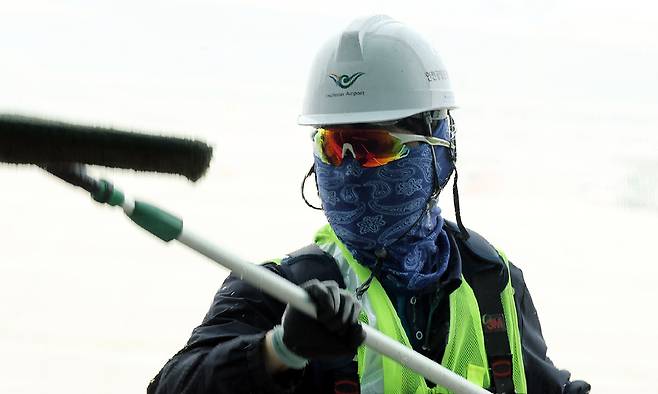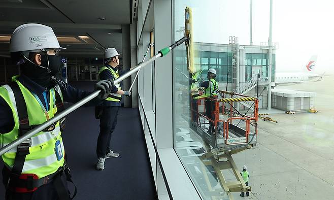 인천국제공항 제1여객터미널에서 인천국제공항공사 작업자들이 봄맞이 유리 외벽 대청소를 하고 있다. 인천국제공항공사는 매년 봄 여객터미널과 접근도로 등 공항 주요 시설에 대한 환경정비를 진행한다.