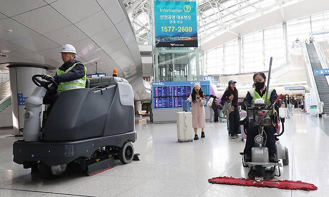 인천공항 운영서비스 직원 이정숙씨가 제2 터미널 출국장에서 청소차로 바닥의 먼지를 제거하고 있다.