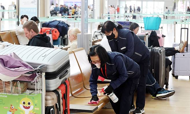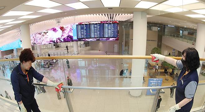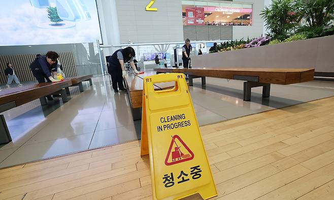 인천공항운영서비스 직원들이 인천국제공항 여객터미널에서 먼지를 제거하는 걸레질을 하고 있다.