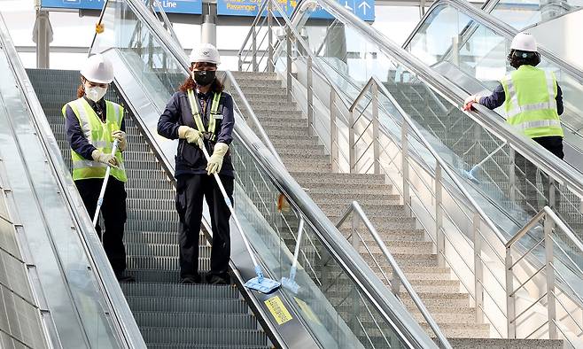 인천국제공항 제1 여객터미널 엘리베이터에서 인천공항운영서비스 직원이 먼지를 제거하고 있다.