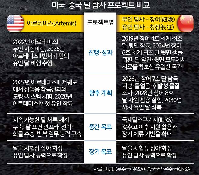 달에서 화성, 심우주까지 이어질 미·중 우주 전쟁의 승부는 발사체·우주선·착륙선 등 핵심 하드웨어 검증과 달 남극 거점 구축, 자원 활용까지 누가 더 빠르고 안정적으로 완성하느냐에 달렸다. 성패는 착륙 이후를 지속할 종합 역량에서 갈릴 전망이다.