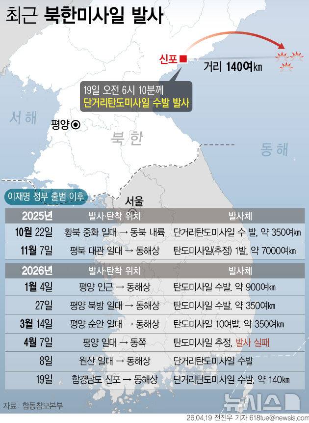 [서울=뉴시스] 19일 합동참모본부에 따르면 북한은 이날 오전 6시 10분께 함경남도 신포 일대에서 동해상으로 단거리탄도미사일 수발을 발사했다. 미사일은 약 140㎞를 비행했으며, 북한이 신포 일대에서 탄도미사일을 발사한 것은 지난 2022년 5월 7일 이후 약 4년 만이다.(그래픽=전진우 기자)