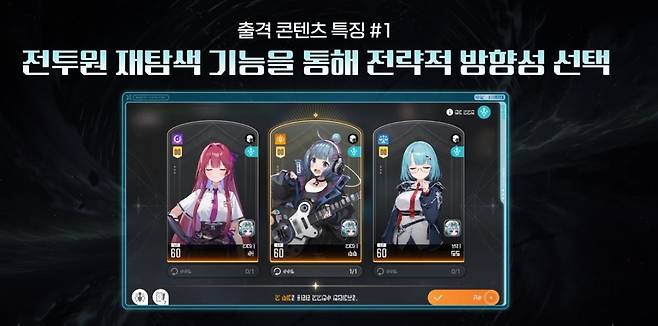 업데이트의 핵심은 신규 로그라이크 모드인 ‘출격’이다. 매 탐사마다 경로와 적, 선택지가 달라지는 오리지널 덱빌딩 콘텐츠다. 세이브 데이터가 따로 저장되지 않아 이용자의 전략 통제와 선택이 전체 탐사 결과를 좌우하게 된다. 출격 시 1명의 전투원으로 시작해 탐사를 진행하며 다른 요원들이 합류해 최대 4인 파티를 운영하게 된다.