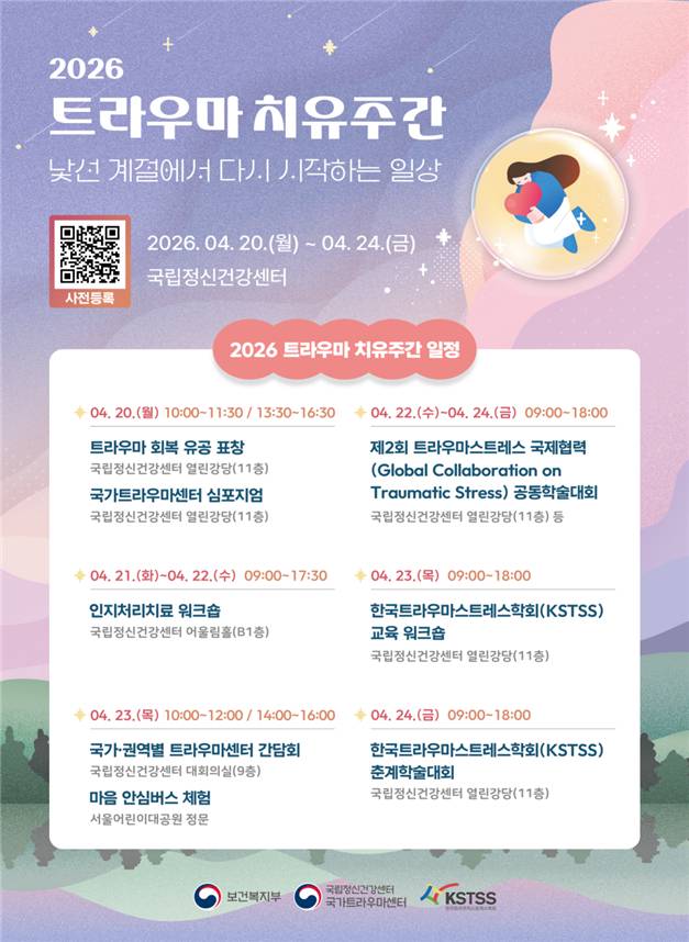 국립정신건강센터는 20일부터 24일까지 '2026 트라우마 치유주간' 행사를 개최한다고 19일 밝혔다.