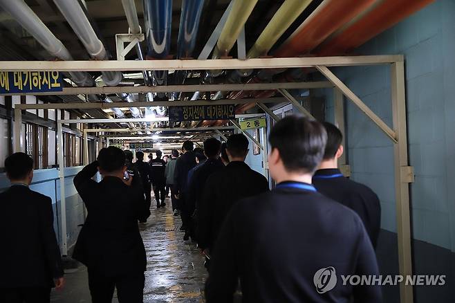 (서울=연합뉴스) 법무부는 지난 15일 경기 안양시 동안구 안양교도소에서 제2차 교정시설 현장 진단을 실시했다. 이번 현장 진단은 안양교도소의 노후 시설과 열악한 수용 환경을 점검하고 과밀수용 해소 및 시설 개선 방안을 모색하기 위해 법무부 장관과 법조기자단이 직접 수용생활을 수행하는 프로그램으로 진행됐다. 사진은 이날 실시된 교정시설 현장 진단에 참여한 법조기자단이 이동하는 모습. 2026.4.19 [법무부 제공. 재판매 및 DB금지]