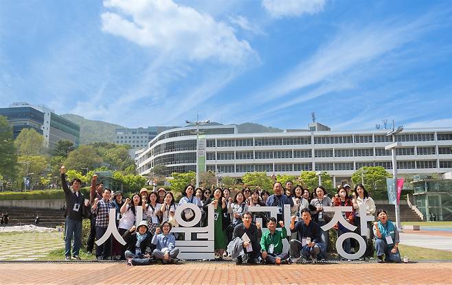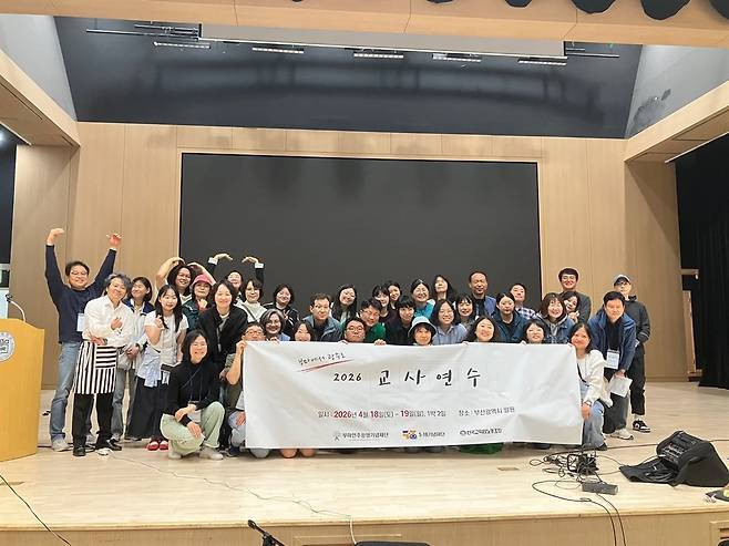 | ▲ 프로젝트 그룹 봄꽃의 공연을 마치고, 공연팀과 교사들이 무대에 올라 함께 사진을 찍었다. 모두가 감동의 도가니였다며 엄지손가락을 치켜세웠다. |