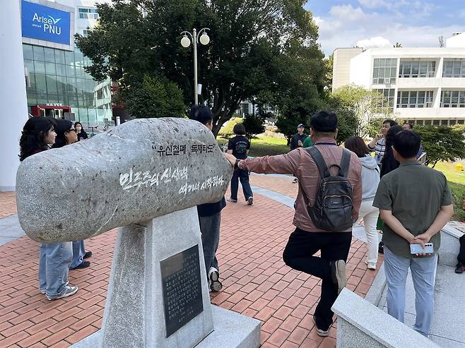 | ▲ 건설공학관(옛 중앙도서관) 앞에 세워진 발상지 표석 앞에서 교사들이 부마민주항쟁 해설사의 설명을 경청하고 있다. |