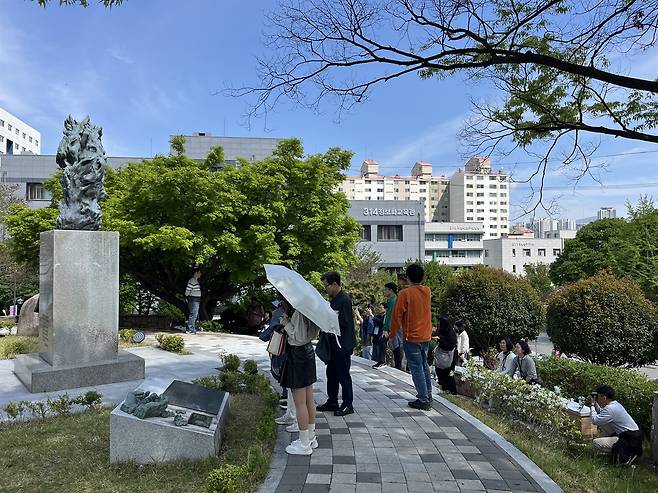 | ▲ 부마민주항쟁 답사는 대개 항쟁탑에서 마무리된다. 항쟁탑 주위엔 부산대학교 출신 민주화운동 유공자들의 자취가 선연하다. |