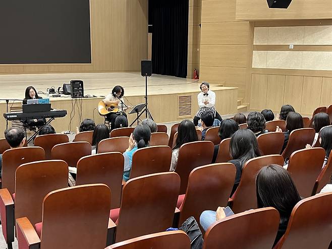 | ▲ 부산 지역 프로젝트 그룹 '봄꽃'의 공연 모습. 구수한 경상도 사투리로 전하는 부마 민주항쟁의 '미시사'에 교사들은 박수로 화답하며 울고 웃었다. 부마 민주항쟁에 관심 있는 이라면 반드시 들어야 할 필수 코스라는 생각이 들었다. |