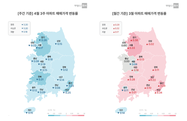 부동산R114의 4월 셋째 주 AI 시세 조사에 따르면 전국 아파트 매매가격은 0.20% 하락했다. 서울이 0.17%, 수도권이 0.20% 떨어졌고 5대 광역시도 0.20% 하락하며 전국 17개 시·도 모두 약세를 나타냈다. 대구 역시 매매가격이 0.14% 하락해 전국적인 조정 흐름에 동참했다.