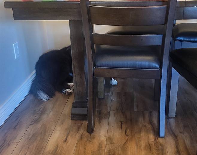 | ▲ 아들의 반려견. 떠날 때를 직감한 듯 식탁 밑으로 숨어버린 모습 |