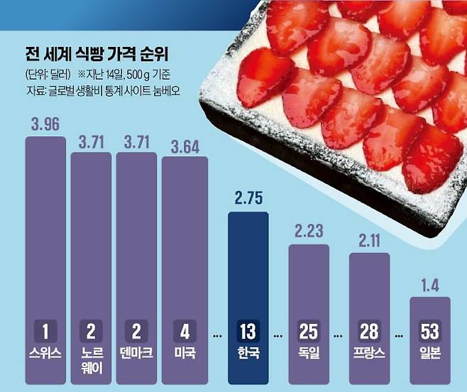 글로벌 생활비 통계 사이트 ‘눔베오’가 조사한 이달 각 국의 식빵(500g) 평균 가격이다. 인근 일본보다는 두 배 가까이 비싸며, ‘빵 종주국’이라는 프랑스, 독일 등 유럽보다도 비싸다. 아시아 국가 가운데서는 빵값으로 1위를 차지했다. 한국의 빵 가격은 해외에 비해 높은 편이다. 식빵 외에 바게트는 한국에서 5000∼6000원대인 반면에 프랑스 현지에서는 1.2유로(약 2093원)에 판매되고 있다. 서울 익선동, 서촌, 성수동 등 ‘핫플레이스’에 위치한 카페에선 케이크 한 조각이 2만원에 육박하는 사례도 있다. 한국소비자원에 따르면 지난달 서울 기준 김치찌개 백반 외식 비용은 평균 8654원. 백반 두 번 먹어도 케이크 조각 가격에 못미친다.