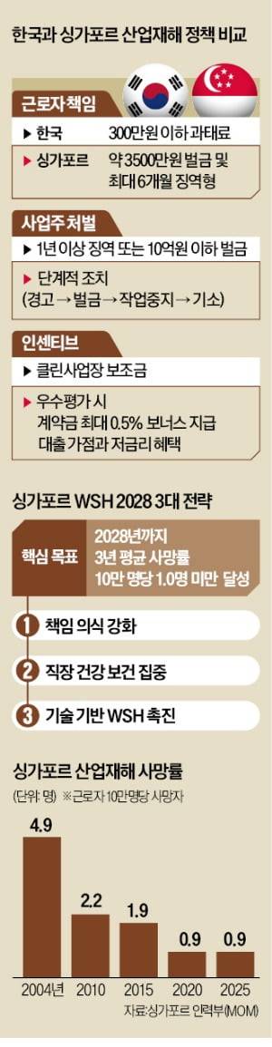 싱가포르는 산재 예방 모범 국가로 꼽힌다. 2004년 10만 명당 4.9명이던 산재 사망률을 지난해 0.96명으로 낮췄다. 그 배경에는 2006년 시행된 WSH법(산업안전보건법)이 있다.