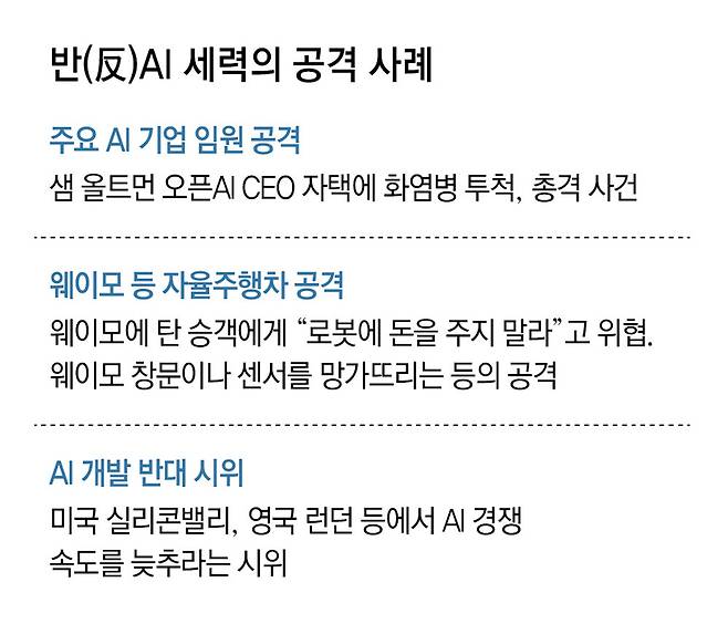 가장 먼저 갈등이 불거져 나온 곳은 세계 정보기술(IT) 업계를 이끄는 미국 실리콘밸리로 최근에는 '반(反)AI' 세력이 오픈AI의 샘 올트먼 최고경영자(CEO)의 자택에 화염병을 던지는 사건까지 발생했다.
