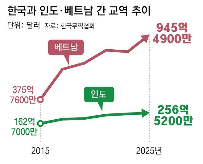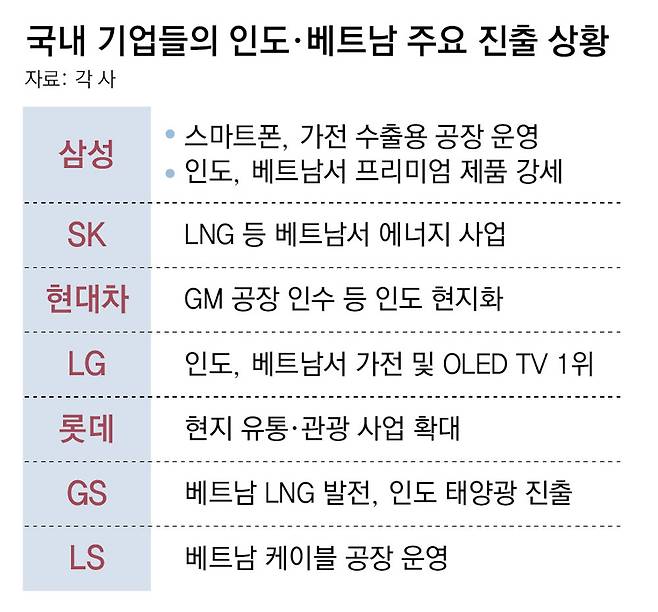 이번 방문에서는 각국 정부 주도로 가속화되는 에너지, 인프라 투자 역시 우리 기업들에 기회가 될 것으로 보인다. SK이노베이션은 올 2월 베트남에서 현지 기업들과의 컨소시엄으로 3조3000억 원 규모의 액화천연가스(LNG) 발전 프로젝트 사업을 따냈다. 1.5GW(기가와트) 규모로 원전 1, 2기에 맞먹는 초대형 프로젝트다. GS는 인도와 베트남에서 각각 태양광 및 LNG 발전 사업을 확대하는 중이다.