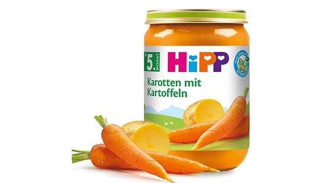 해당 이유식은 생후 5개월부터 먹기 좋다는 독일 업체 히프의 '당근과 감자' 190g 유리병 제품입니다.