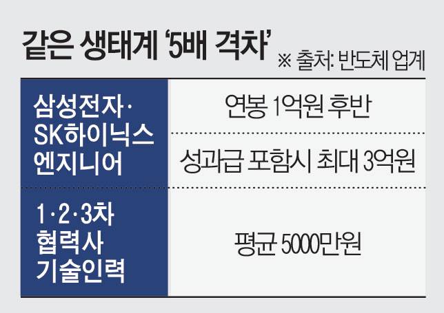 더 큰 문제는 노동시장 이중구조다. 삼성전자와 SK하이닉스 반도체 엔지니어의 연봉은 1억원 후반에서 성과급 포함 시 3억원대에 달한다는 것으로 알려졌다. 반면 1·2·3차 협력사 기술 인력 평균 연봉은 5000만원 수준에 머문다. 대기업 성과급이 높아질수록 이 격차는 더 벌어진다. 원청 인건비 부담이 증가하면 협력사 납품 단가 인상 여력은 줄어들고 이는 협력사 직원 처우 정체로 이어지는 구조다. 동일한 생산 생태계 안에서 보상이 5배 이상 벌어지는 왜곡이 고착될 수 있다는 우려가 나온다.
