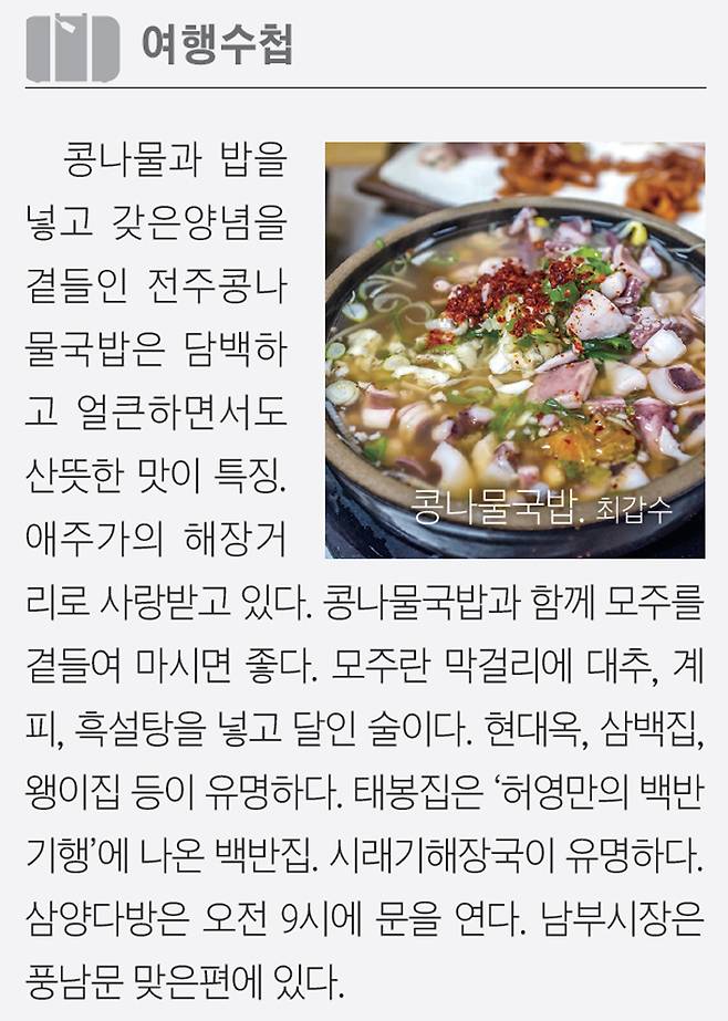 한옥마을을 한 바퀴 돌아 다시 풍남문 앞이다. 풍남문 앞은 남부시장이다. 이른 아침부터 상점들이 문을 연다. 일찌감치 장을 보러 나온 주민으로 시장은 제법 복잡하다. 남부시장에는 유명한 콩나물국밥집이 몇 곳 있는데, 나는 오래전부터 찾던 어느 집으로 들어간다. 잘게 썬 오징어가 듬뿍 올라간 콩나물국밥 맛은 예나 지금이나 변함이 없다. 이 집은 수란이 담긴 그릇을 따로 내주는데, 국밥 국물을 몇 숟가락 붓고 마른 김을 잘게 찢어 비벼서 먼저 먹는 것이 이 집 콩나물국밥을 맛있게 먹는 방법이다. 서류 가방을 자리 옆에 놓고 중년의 남자가 국밥을 먹고 있고 등산복을 가볍게 차려입은 아주머니 세 명이 들어와 옆자리에 앉는다. 모두 현지인이다. 나는 그들 틈에 섞여 국밥을 먹는다.