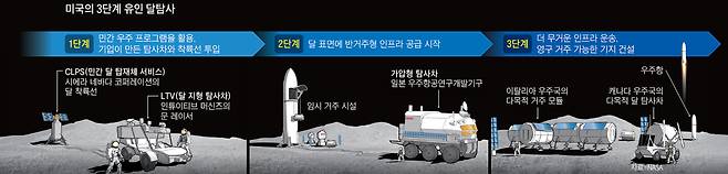나사는 달에 지속적인 유인 탐사 거점을 확보하기 위해 단계적 접근 방식을 추진하겠다고 발표했다. 1단계로 민간 기업이 개발한 착륙선과 탐사차, 계측기 등을 보낸다. 여기에는 원자력 배터리도 포함된다. 2단계는 반거주형 인프라와 정기적인 물자 수송 체계를 구축해 달 표면에서 우주비행사의 탐사 활동을 지원한다.