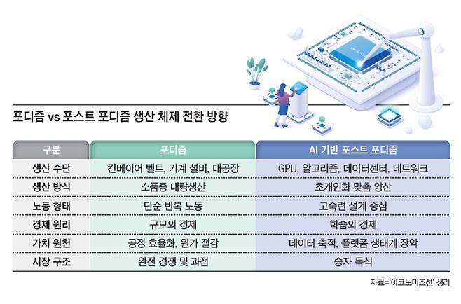 인간의 학습 능력을 컴퓨팅 시스템으로 구현한 인공지능(AI) 기술은 개인화한 맞춤형 서비스 양산 시대를 열었다. 기술혁신을 넘어서는 산업구조 재편을 촉진하고 있다. 표준화 제품을 대량생산하는 포디즘(Fordism) 시대는 저물고, 다품종·유연 생산의 포스트 포디즘(Post Fordism)이 보편화하고 있다.