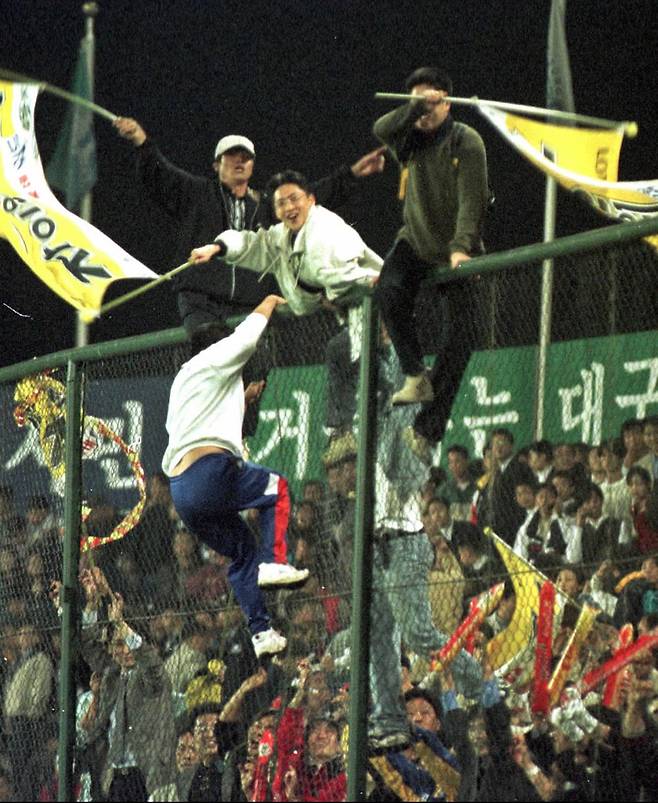 | ▲ 1999년 10월 프로야구 플레이오프 7차전에서 롯데의 승리가 확정되자 흥분한 롯데 응원단이 1루측 철망 위에 올라가 깃발을 흔들며 환호하고있다. |